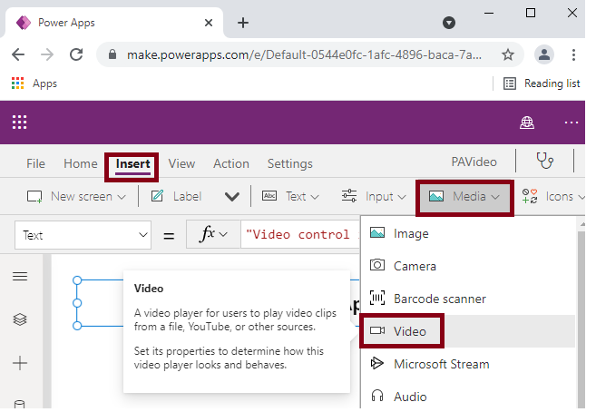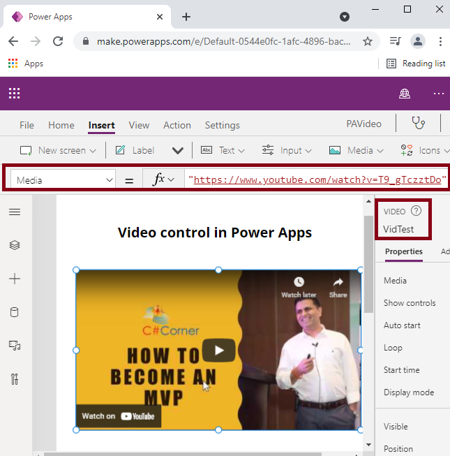 Insert the Video Control and set the Name property as VidTest and Media property as "https://www.youtube.com/watch?v=T9_gTczztDo".