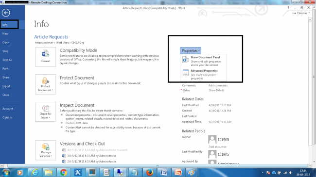 Open Document Information Panel (DIP) in Word 2010 and 2013