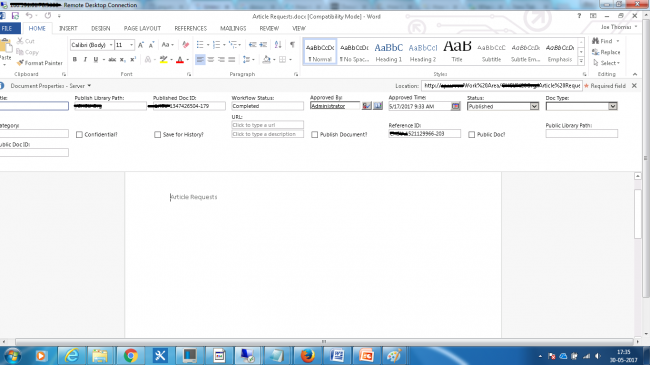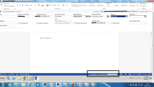 - If a user wants to update the column values/meta data, they can update directly from a client application using this Document Information Panel (DIP). Opening the document with valid credential, document properties/meta data value will be updated into the site.