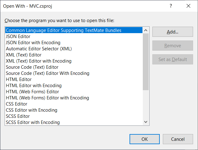 This article is to introduce the way to open the project files in Visual Studio Solution, however, the method can be used for opening any files from within Visual Studio Solution Explorer.