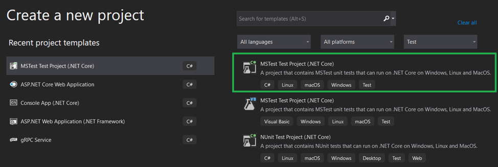 The next step is to create a .NET Core – MSTest Test Project.