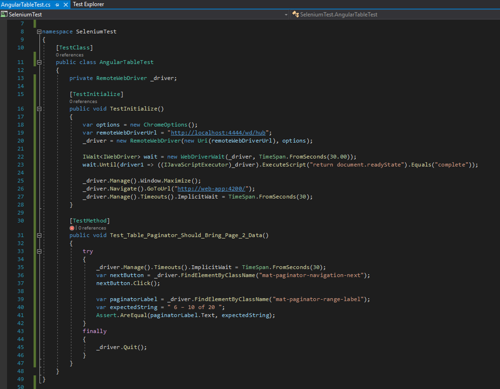 I have written a very simple test to test the paginator of the table. This test checks that when the user clicks on the Next button, data in the grid should get updated.