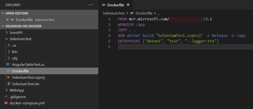 Let’s add the last service in our docker-compose file, which is to run our MSTest app as well inside a container.