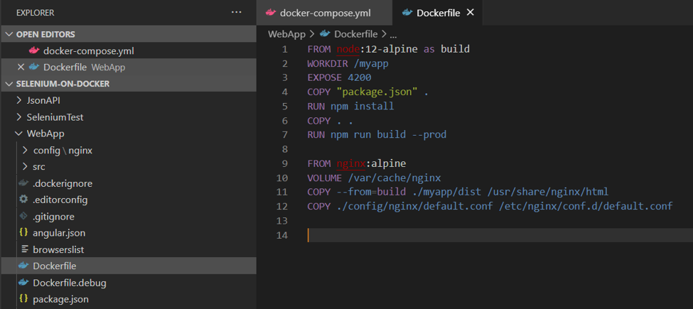 To host an Angular app in the container, I added one more Dockerfile as below. Here I’m doing multi-stage build and hosting Angular app inside NGINX container.