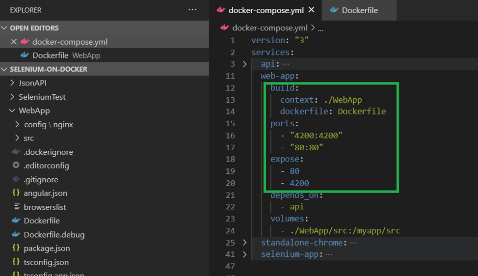 I will also update my web-app service in the docker-compose file for the Angular app as below.