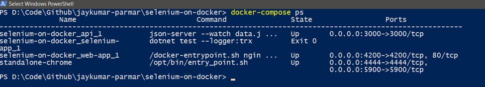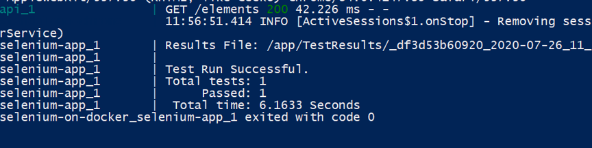 Now we have all the pieces of the puzzle at the right place and let’s run docker-compose up –build command to run tests inside a container.