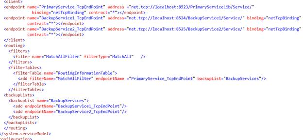 Now, you have successfully hosted the Services Primary, Backup Service 1, and Backup Service 2. Now, it is time to define the Routing Service, which will pass the messages to the appropriate Service, based on availability. As I have already mentioned in my previous articles, we shouldn’t forget this simple sentence “Address the filter and filter end” . It is just a sentence I have framed myself to remember the RoutingServer configuration steps, which are Address, Filter table, Filters and endpoint, As I shown in the Figure 1.3 snapshot configure the Routing Service accordingly