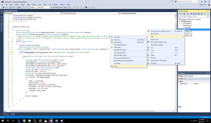 Now, you can see that the Service.svc.cs window opens or you can see it on the right side solution panel. Open that file.
