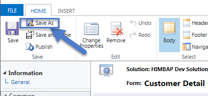 Let’s first create our custom solution and add our entity into solution using "Add Existing" button under solution toolbar. After that, we can open entity form editor and make copy of form using "Save As" like following: