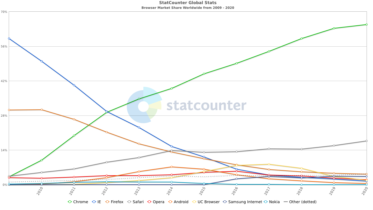 Yearly usage share of web browsers from 2009 to November 2020 according to StatCounter