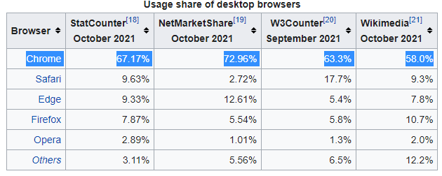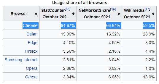 A - 2 -1: Usage share of all browsers in October 2021 (Table)