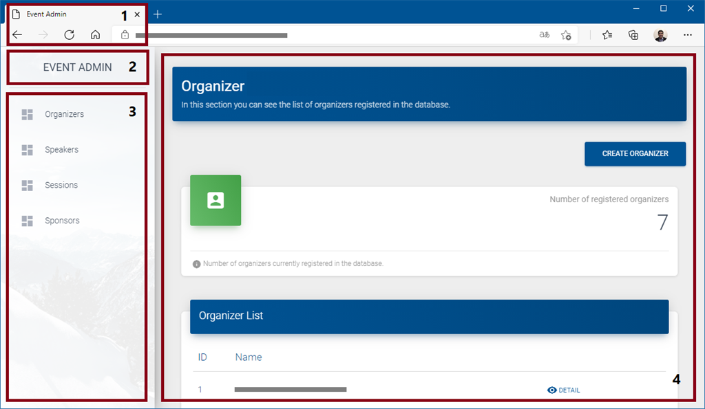 - Section 4, is the section where all the contents of the daughter pages (list of speakers, sponsors, sessions, organizers; and the creation and modification forms for each of these) will be displayed.