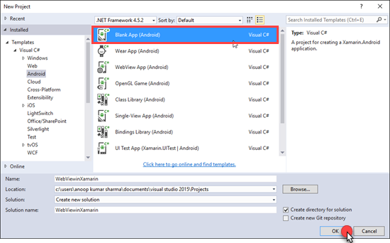 Create new Xamarin Android project. Click on the Blank android app, give it a meaningful name and then click OK.