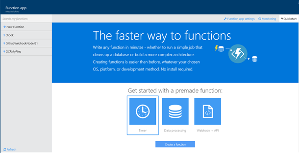Let's say, our customer came to us and said 'hey, can we implement a simple thing that when an image is uploaded, we check to see if it's within our specified dimensions, and, if not, we edit/resize the image to make it fit our requirements.' Before Functions, we would have had to either add this new functionality to our existing web offering in code somewhere, integrate it, and upload the changes. With functions, we can simply go into an online editor, define an endpoint (in this instance, of where to monitor for incoming image files), and write some code that will be processed when the image lands. And that's it. No hosting setup, not even 'file | new | project' for goodness sake! (well, you can do that, but actually it's not needed).