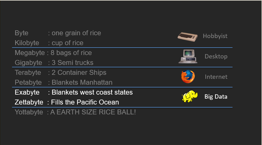 Think 15 years back, when we were using computers. What was Data at that time? It was in bytes or kilobytes mostly. Then, we moved to desktops and data increased to Megabytes and Gigabytes. Then, the World Wide Web got introduced and data increased exponentially and reached Terabytes and Petabytes. The following image demonstrates it: