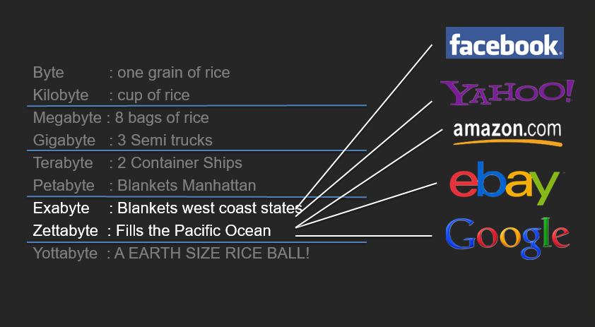 Now today, big companies like Microsoft, Google, eBay, Amazon, and Netflix all have a lot of data about users. The whole data in the world has doubled in just the last two years. Today, data is available in Exabytes and Zettabytes. The following image may clear the concept.