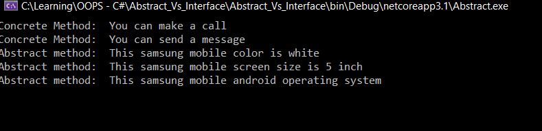 Console.WriteLine("Abstract method: This samsung mobile screen size is 5 inch");