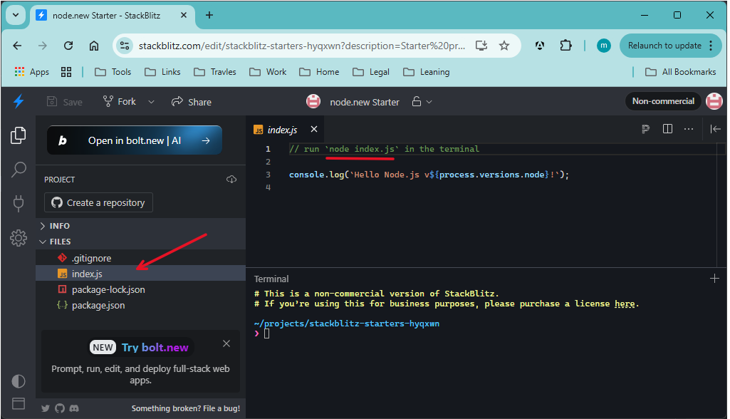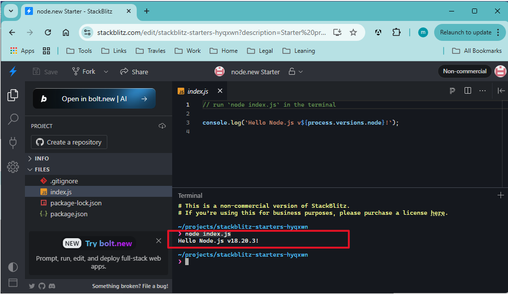 A default page, index.js, is opened. Type the command: Node index.js in the terminal to run the mini project: