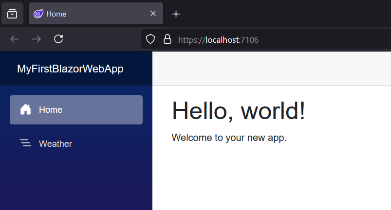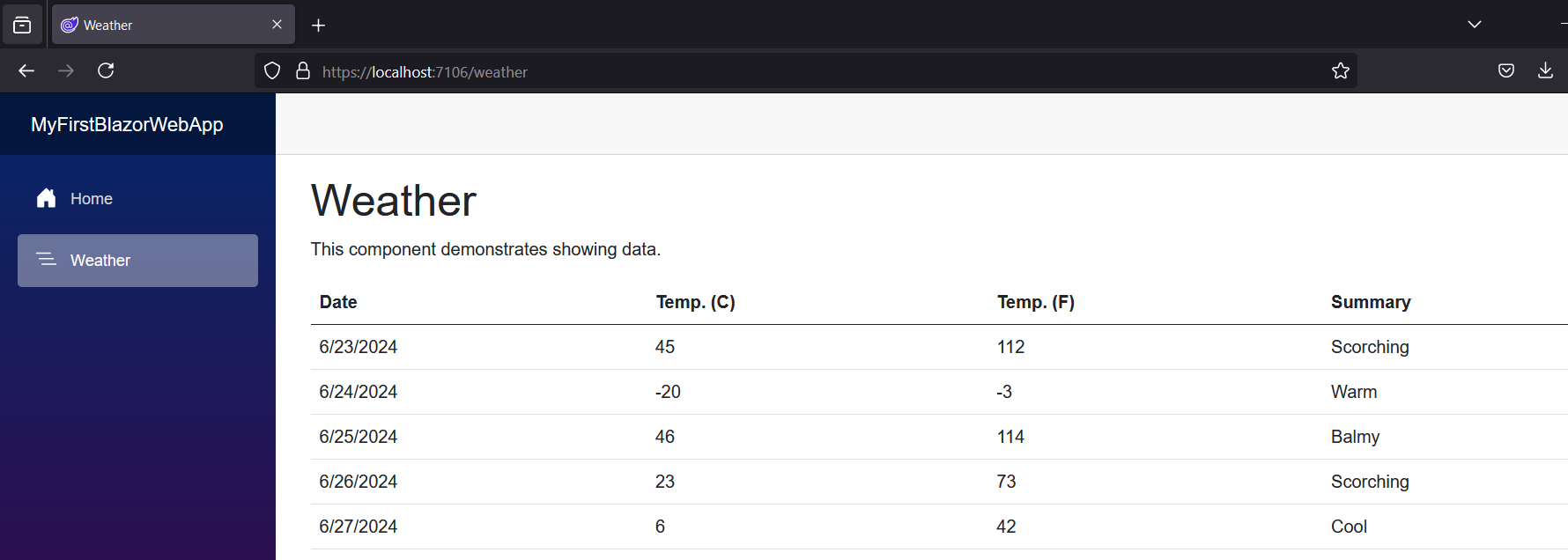 As you can see, this Weather.razor component is now placed in the center, having replaced the Home.razor component.