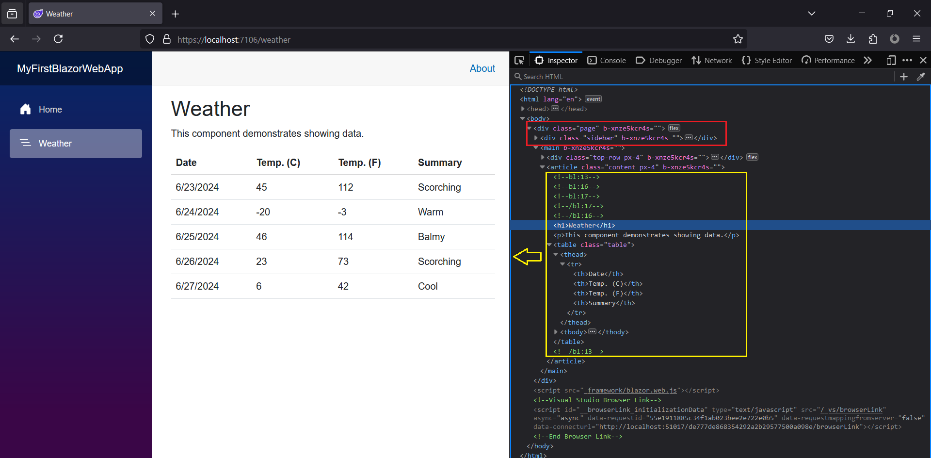 In the center is the code from Weather.razor, and just above that are a couple of <div>, One with class "page" and an inner one with class "sidebar". These are from MainLayout.razor, lines 3 and 4. So, in the end, all these components come together to form a single page.