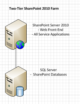 In a two-tier deployment, SharePoint components and the database are installed on separate servers. This kind of deployment is mostly called a small farm. The front-end Web servers are on the first tier and the database server is located on the second tier.