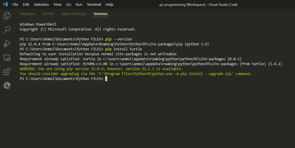 Now run the command: pip install turtle, if it is already available it will display “Requirement already satisfied” otherwise your installation will be started.