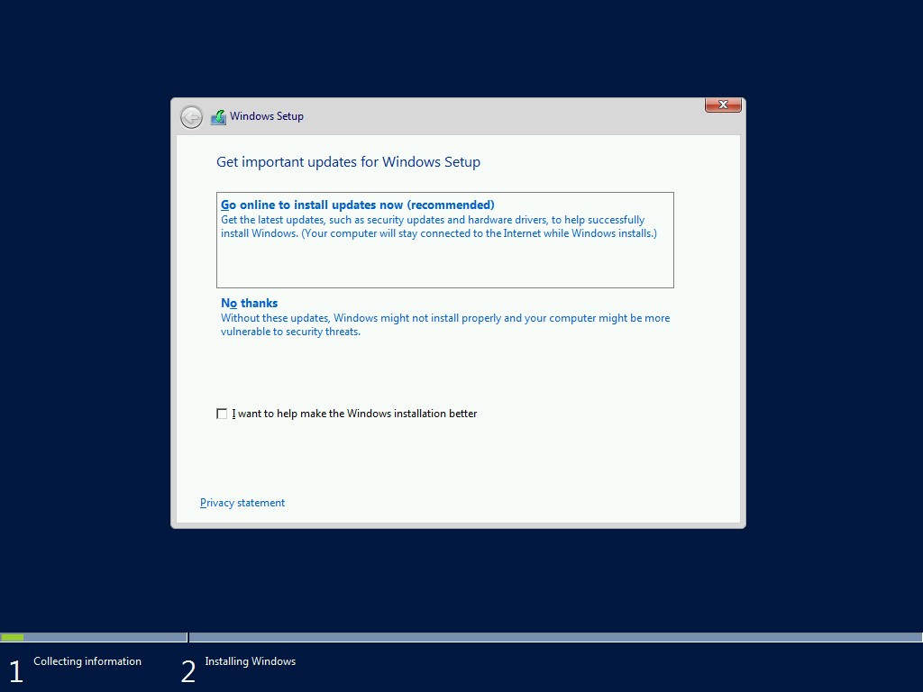 Select Install Now. On the next page check for security and driver updates.