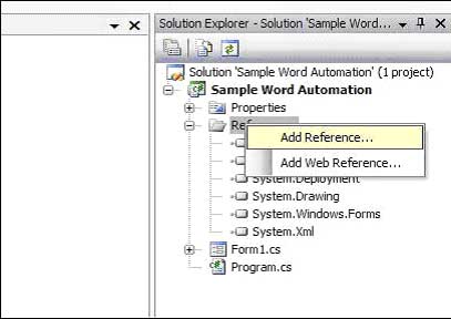 Starting off, the first step is to include the Word DLL's to the Solution. This can be done by right clicking the Reference Folder in the Solution explorer of the project and select Add Reference.