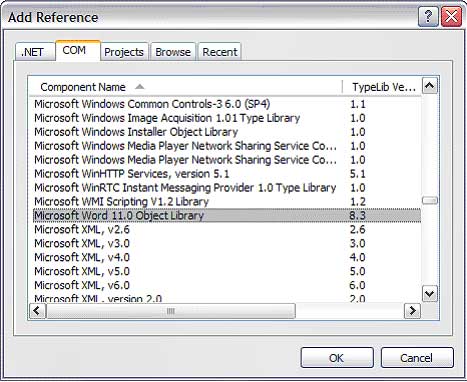 Browse Through the available COM objects and Select Microsoft Office 11.0 Object Library & Microsoft Word 11.0 Object Library. This DLL has all the methods which we do to perform the automation.