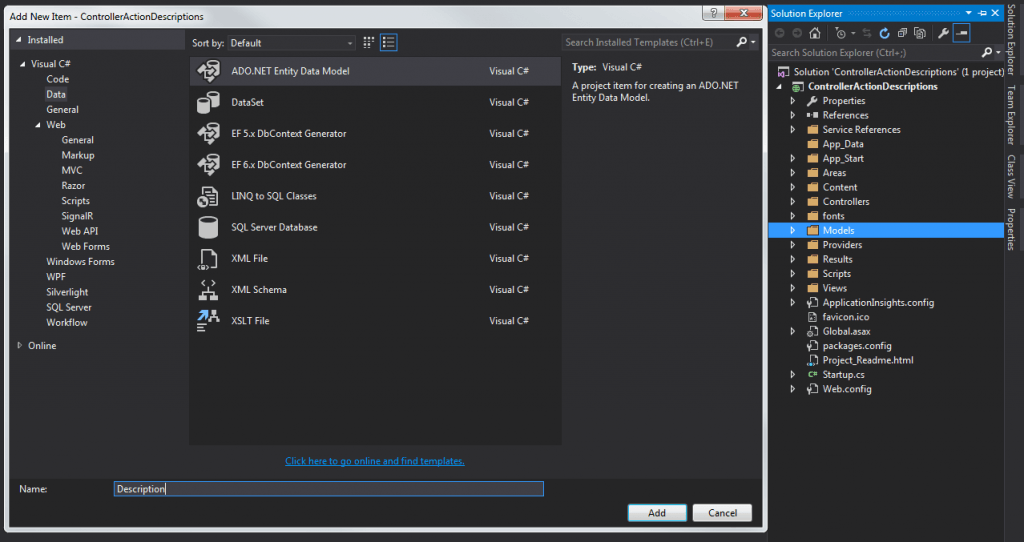 Select the Model Class, DBContext then name your controller and click OK. I hope a controller with the CRUD actions like the preceding one has been generated for you.