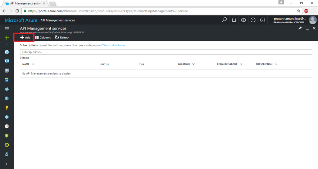 Once the dashboard appears, now it’s time to create API management account in Azure portal. Click browse option.