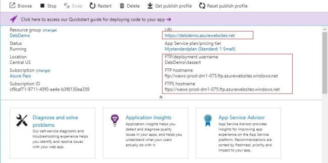 Finally, it will create a Web App with DebDemo name. Here are the details of this web app.