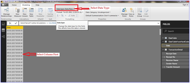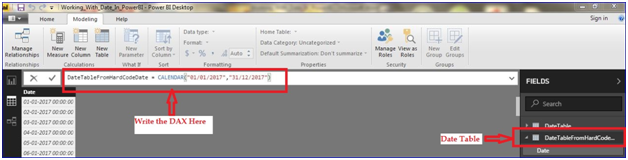 I have taken DateTableFromHardCodeDate as table name and “01/01/2017” as the minimum date and "31/12/2017" as maximum date. After clicking on the enter button the date table with date data will be created.