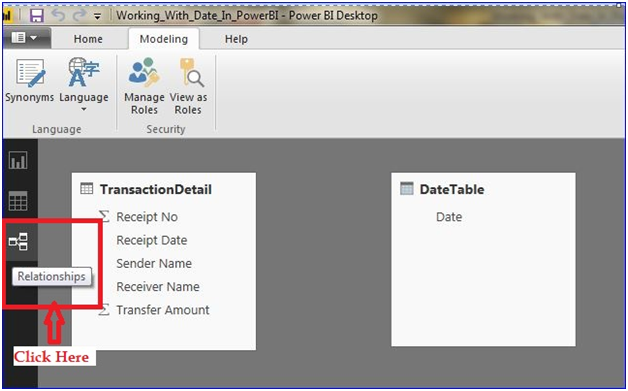 To set the reference of date table with transaction detail table click on Relationships this is in the left side of the Home tab. After clicking on the relationships table the following screen will appear.