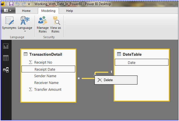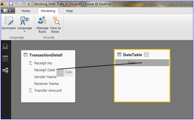Now click on DateTable Date column and drag it into the TransactionDetail table Receipt Date Column as below