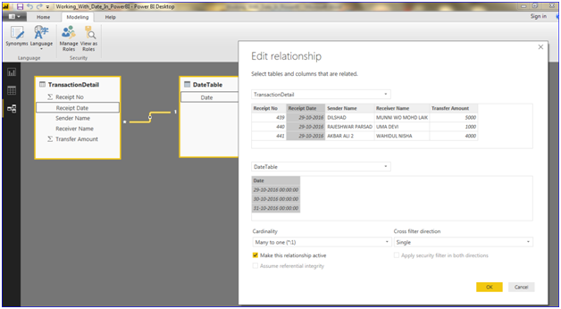 After double-clicking on the relation you can see the details of the relationship between those tables here you can edit the relationship also. Here you can see whether the relationship is active or not. You see the filter direction also here.