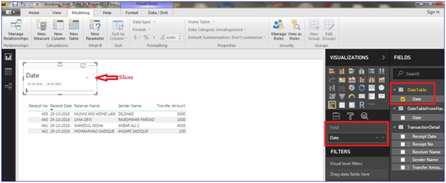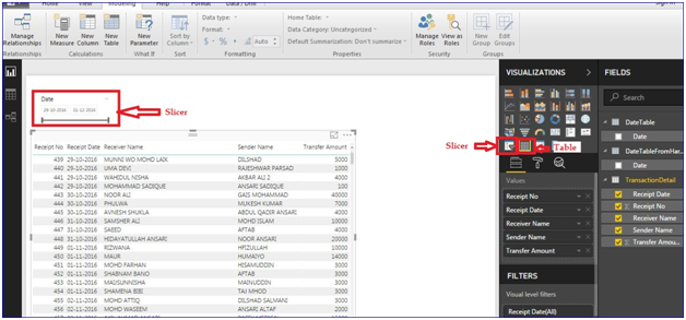 Drag and drop the value on clicking the table from the transaction table. Again copy the table and click on the slicer option available in VISUALIZATIONS. Change the value of Slicer from Date table and the slicer will be created.