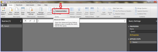 After following either of the above two steps a new query editor window will appear as below. Here you have to click on Advance Editor Option which opens a new advance query editor as below.