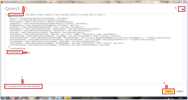 In below screen point 1 and point 2 is the table name. Table name in both place as in Point numbers 1 and 2 should be the same, otherwise, it will give error. Point 3 is the syntax checking result which is done by Power BI automatically. Point 5 is the link of Power BI document where you can read more about adding a custom column in Power BI desktop.