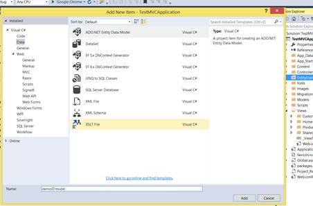 Now, select Data and ADo.NET Entity Framework data model. It gives a name to your Entity Framework, as I had given demoEFmodel.
