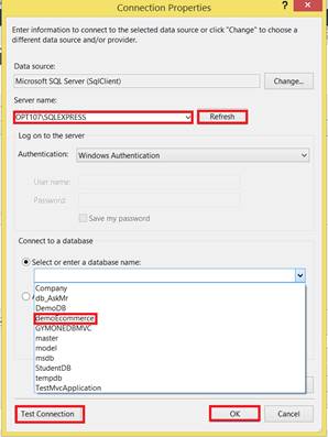 In the Server name, give the Server name of your database and click Refresh. In the dropdown, you should see your database name. In this case, it is demoEcommerce.