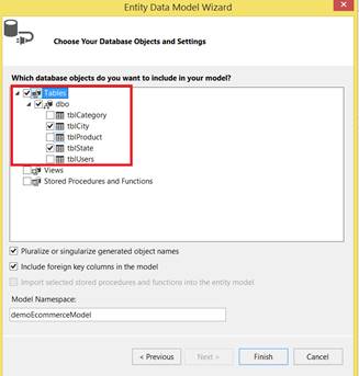 Now, you can create an object of demoEcommerceEntities, access all your tables in your project and perform your DML operations.