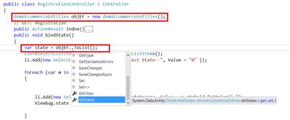 Now, in my Controller, I have created an object of an Entity Framework and as you can see, I can access both the tables (tblCity & tblState). Now, I would be able to perform any DML operations in these tables.