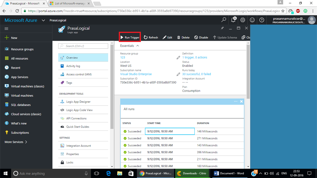 Step 10- Open the properties of Logic Apps and click Run Trigger. It automatically shows the status, start time, and duration etc.