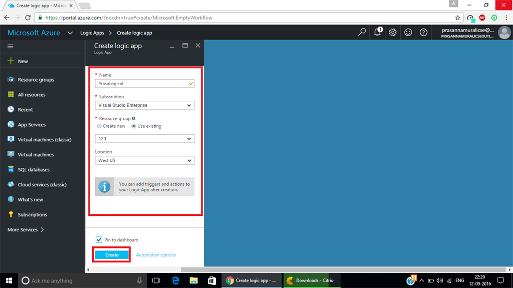 Step 4- In the Logic Apps creation wizard, fill all the mandatory fields such as Name, Subscription, Resource Group etc. and click Create.