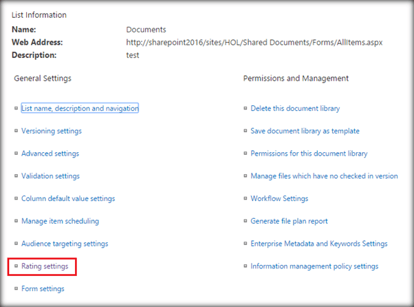 Go to the document library settings. From the settings page, select ‘Rating Settings’ option.