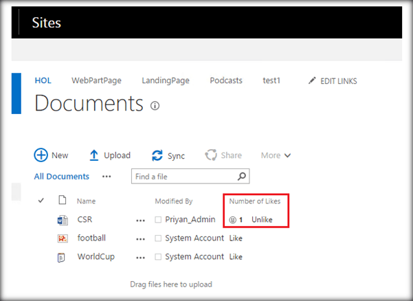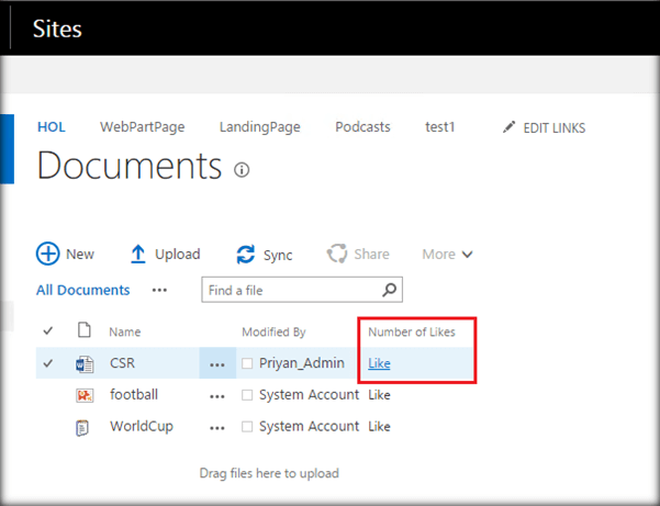 Once the selection has been made, click OK. Now, let's head back to the document library. Like feature has been enabled in this list. This will add a new column “Number of Likes” to the library. Clicking Like button will add a like to the document. A user can like the content only once.