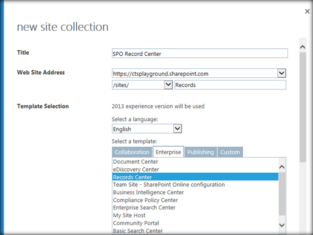 - Template Selection- From Enterprise tab, select Records Center.