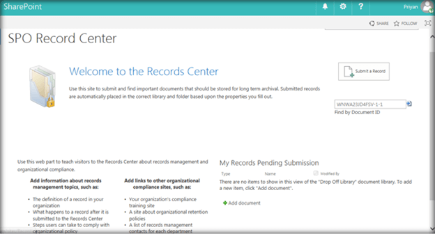 Records Management is one of the primary utilities of SharePoint as an Enterprise Content Management System. One of the out of the box feature of SharePoint that supports record management is being able to use a predefined Record Center Site Collection template. Record center serves as the central location, where the organization can store and manage its documents.