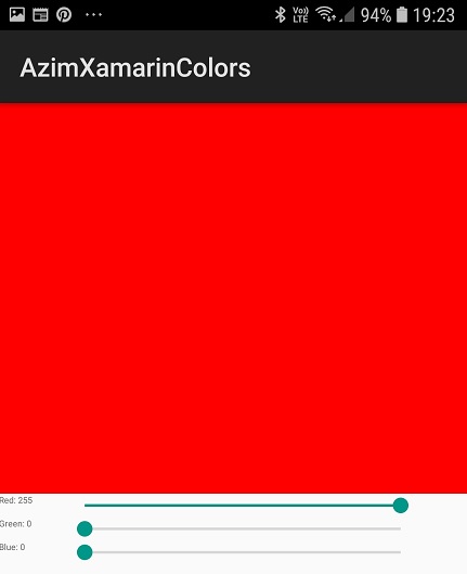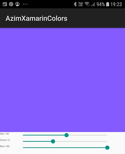The Color structure of the Android.Graphics namespace contains the Rgb() function which takes 3 parameters representing the proportion of red, green and blue colors. Each of the color values must be in the range of 0 to 255 which are specified as the minimum and maximum values of each SeekBar.
